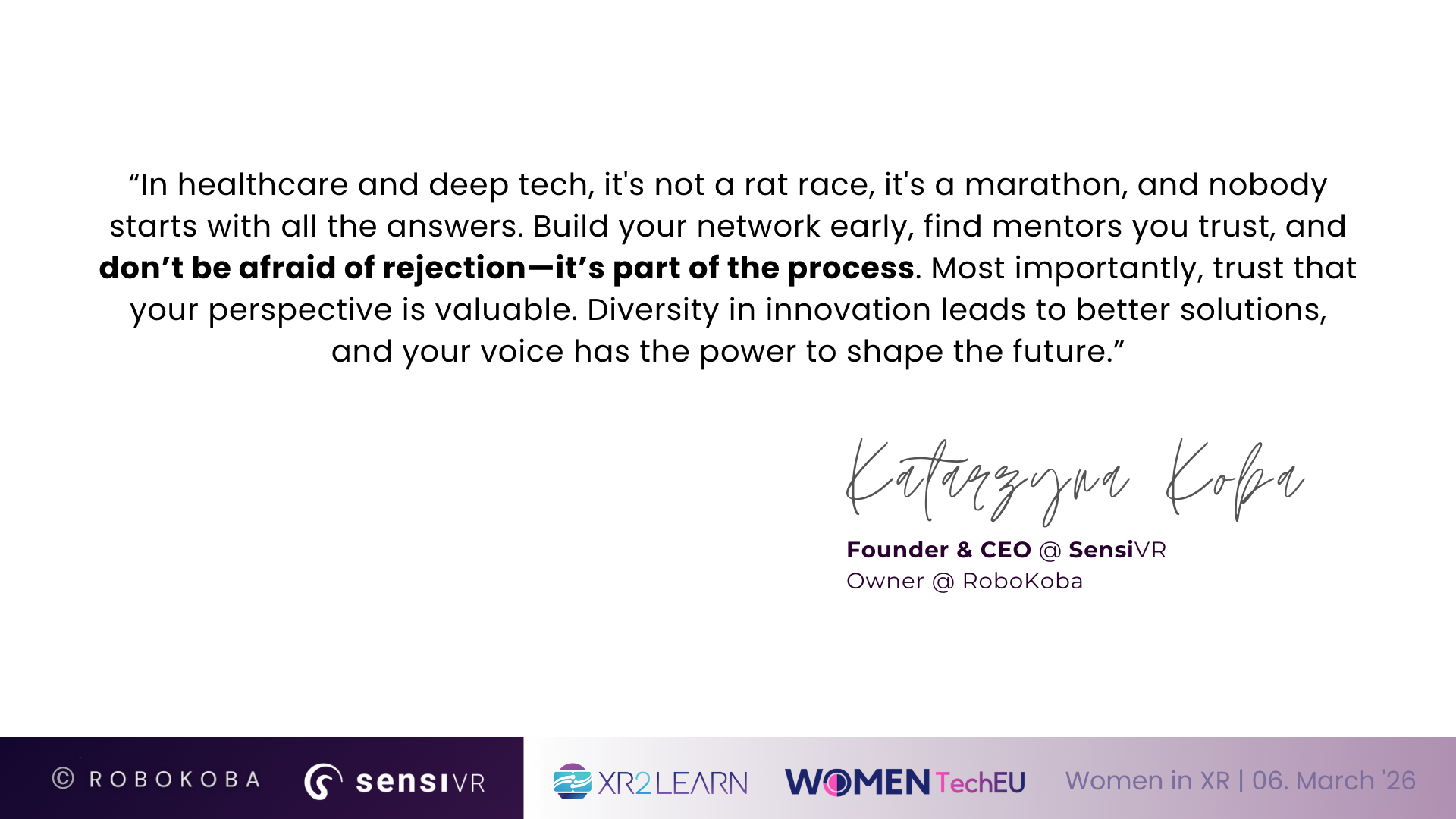 Great initiative! It’s inspiring to see women innovators sharing concrete XR applications and lessons learned across sectors. Great to see a focus not only on representation but also on practical XR applications and real-world impact!